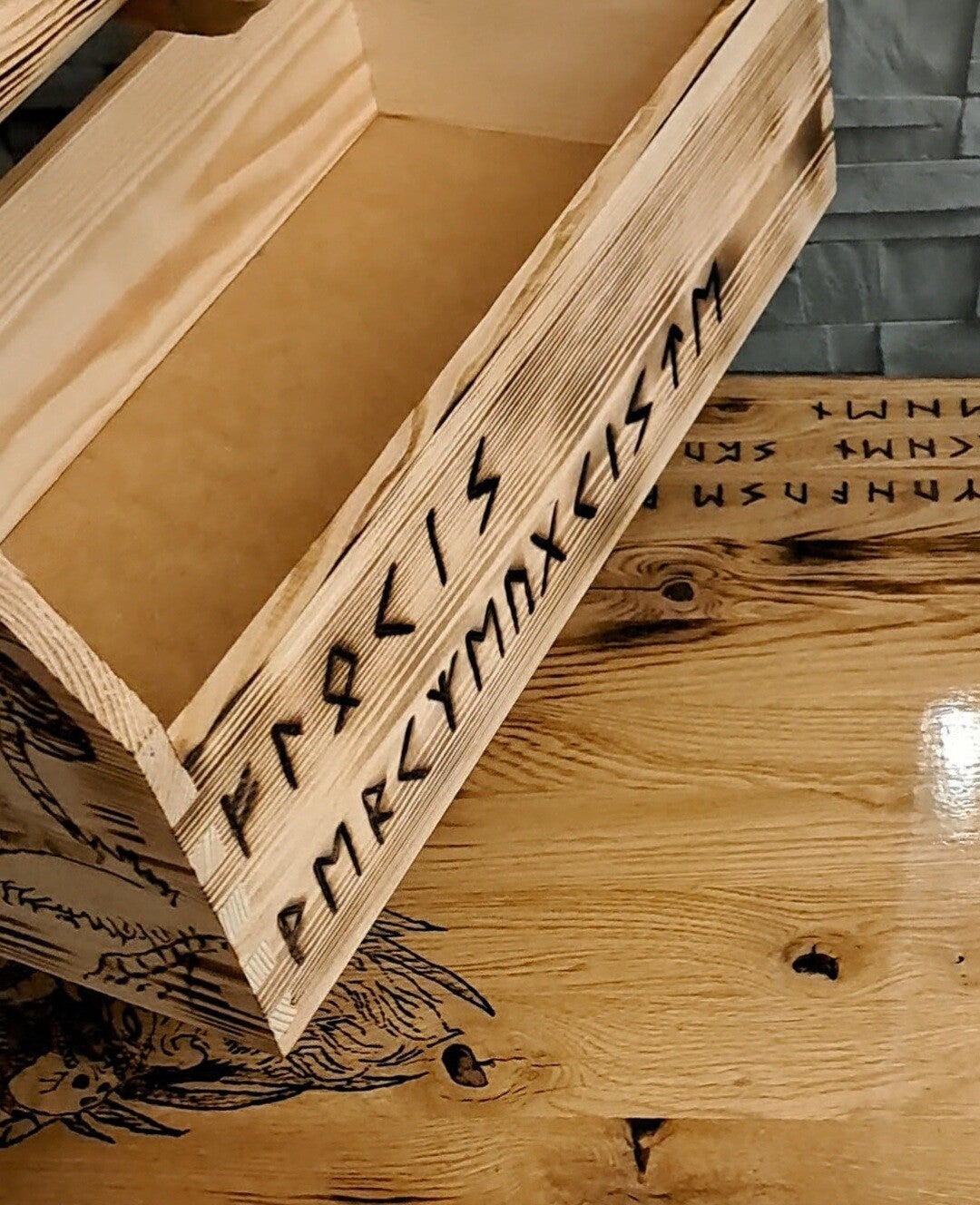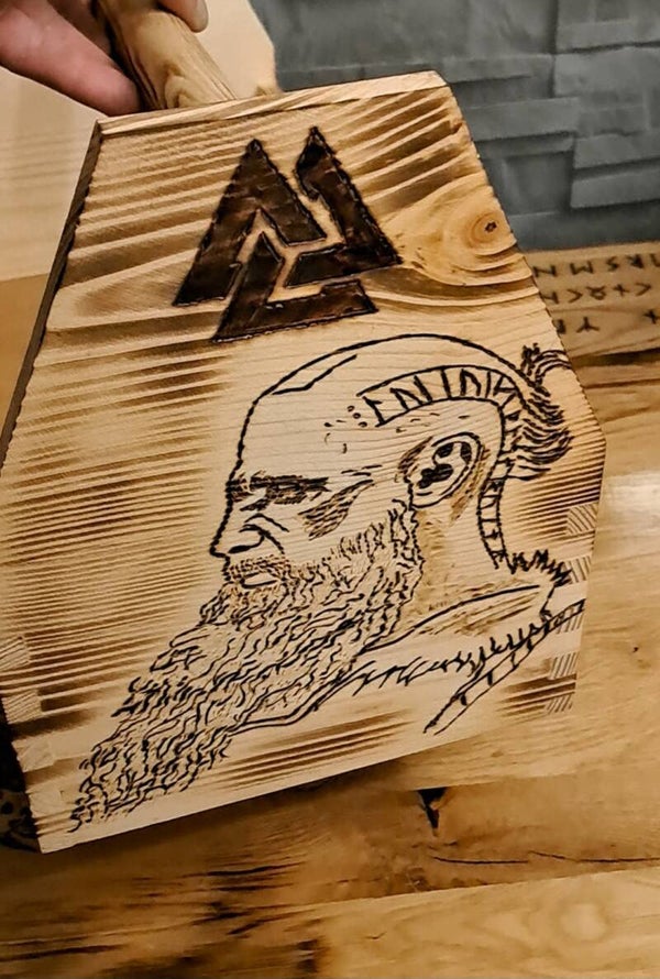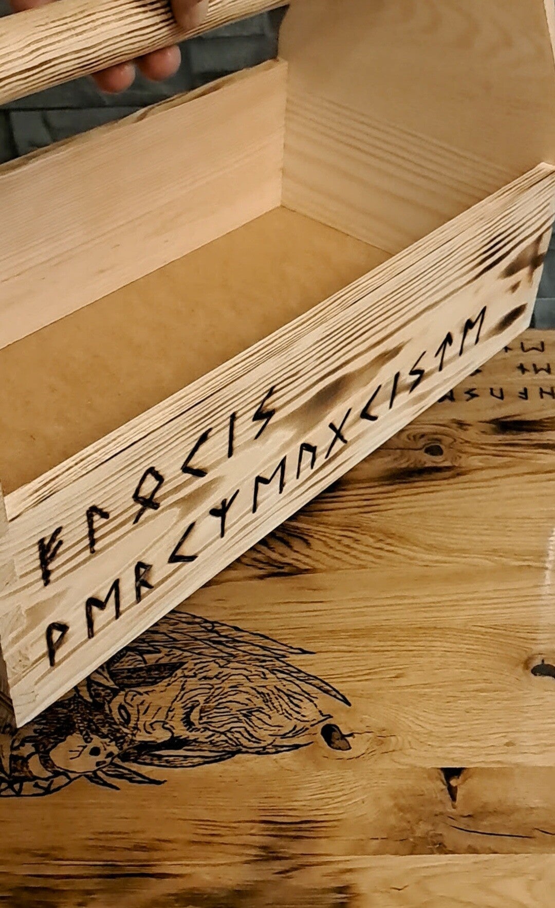 Diese schöne Werkzeugkiste aus Holz ist neu und im nordischen Design. Ist dem Charakter Floki gewittmet.